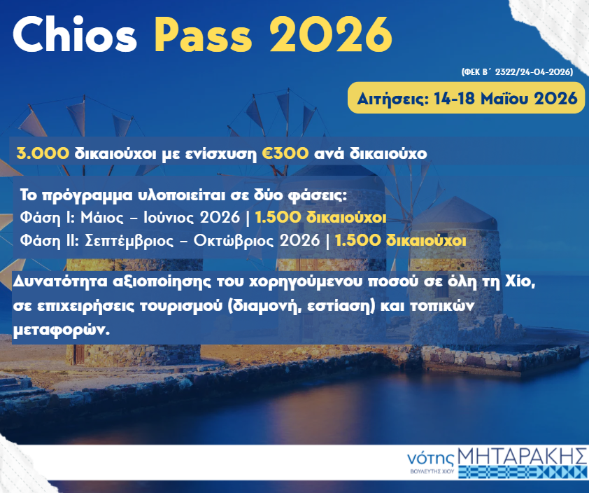Ποιοι είναι οι πυλώνες ανάπτυξης του νησιού; Νομίζω σε αυτό συμφωνούμε τελικά όλοι. Και είναι τέσσερις αυτοί οι πυλώνες. Πρώτα απ' όλα είναι ο τουρισμός και ο τουρισμός είναι ο τομέας που εγώ πιστεύω ότι μπορεί να πετύχουμε τη μεγαλύτερη μεταβολή εισοδημάτων και θέσεων εργασίας τα επόμενα χρόνια. Είναι οι δύο βράχοι της τοπικής οικονομίας. Η πρωτογενής παραγωγή και ειδικά η μαστίχα και η ναυτιλία. Ο Έλληνας ναυτικός που έχει προσφέρει πάρα πολλά σε αυτή τη χώρα, εδώ και δεκαετίες. Αλλά πιστεύω ότι υπάρχει και ένας τέταρτος τομέας που είναι η ευκαιρία. Είναι η καινοτομία. Είναι η εκπαίδευση. Είναι οι σύγχρονες τεχνολογίες, οι οποίες μπορούν να εκμεταλλευτούν το πολύ αυξημένο ακαδημαϊκό επίπεδο των Χιωτών, την παρουσία του Πανεπιστημίου Αιγαίου, αλλά και γενικότερα ενός οικοσυστήματος εκπαίδευσης που έχει δημιουργηθεί στο νησί μας.