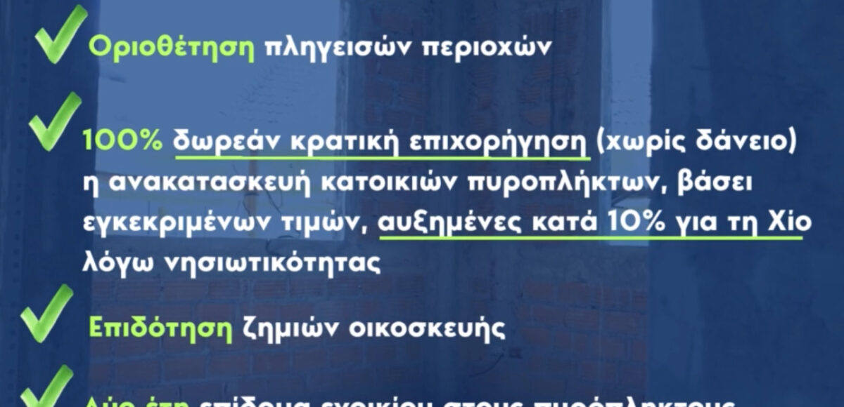 «Με τη δημοσίευση του ΦΕΚ για τις πυρκαγιές του Ιουνίου και Αυγούστου στη Χίο, εξασφαλίζεται 100% δωρεάν κρατική επιχορήγηση, χωρίς δάνειο, για την ανακατασκευή κατοικιών πυροπλήκτων, βάσει εγκεκριμένων τιμών, αυξημένων κατά 10% για τη Χίο λόγω νησιωτικότητας.