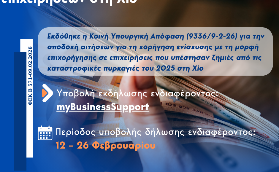 Δημοσιεύθηκε στο ΦΕΚ (Β’ 571) η υπ’ αρίθμ. 9336/9-2-26 Κοινή Υπουργική Απόφαση για τη χορήγηση ενίσχυσης με τη μορφή επιχορήγησης σε επιχειρήσεις που υπέστησαν ζημιές από τις καταστροφικές πυρκαγιές του 2025 στη Χίο.
