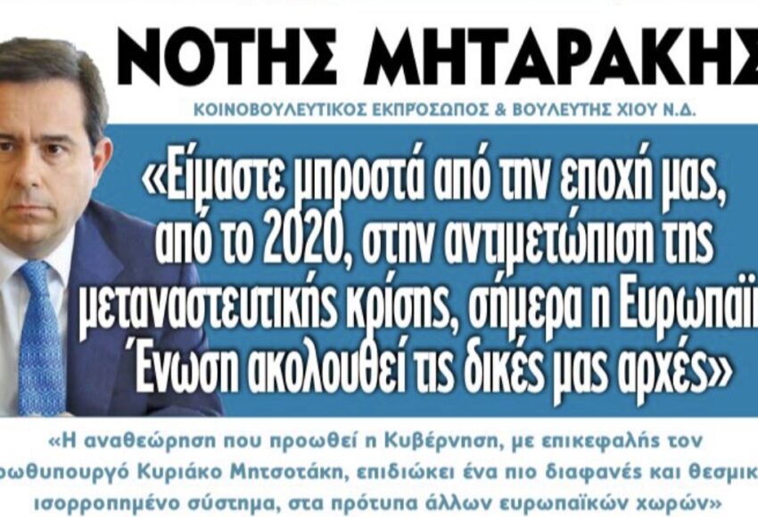 Συνέντευξη του Κοινοβουλευτικού Εκπροσώπου της Νέας Δημοκρατίας και Βουλευτή Χίου, Νότη Μηταράκη στο Attica Times Κύριε Μηταράκη, η Ελλάδα βρίσκεται σε μια κρίσιμη καμπή όσον αφορά τη μεταναστευτική της πολιτική, με νέους νόμους που επιδιώκουν ταυτόχρονα αυστηρότητα στην παράνομη μετανάστευση και ενίσχυση της νόμιμης εισόδου εργαζομένων. Πώς αξιολογείτε την αποτελεσματικότητα […]